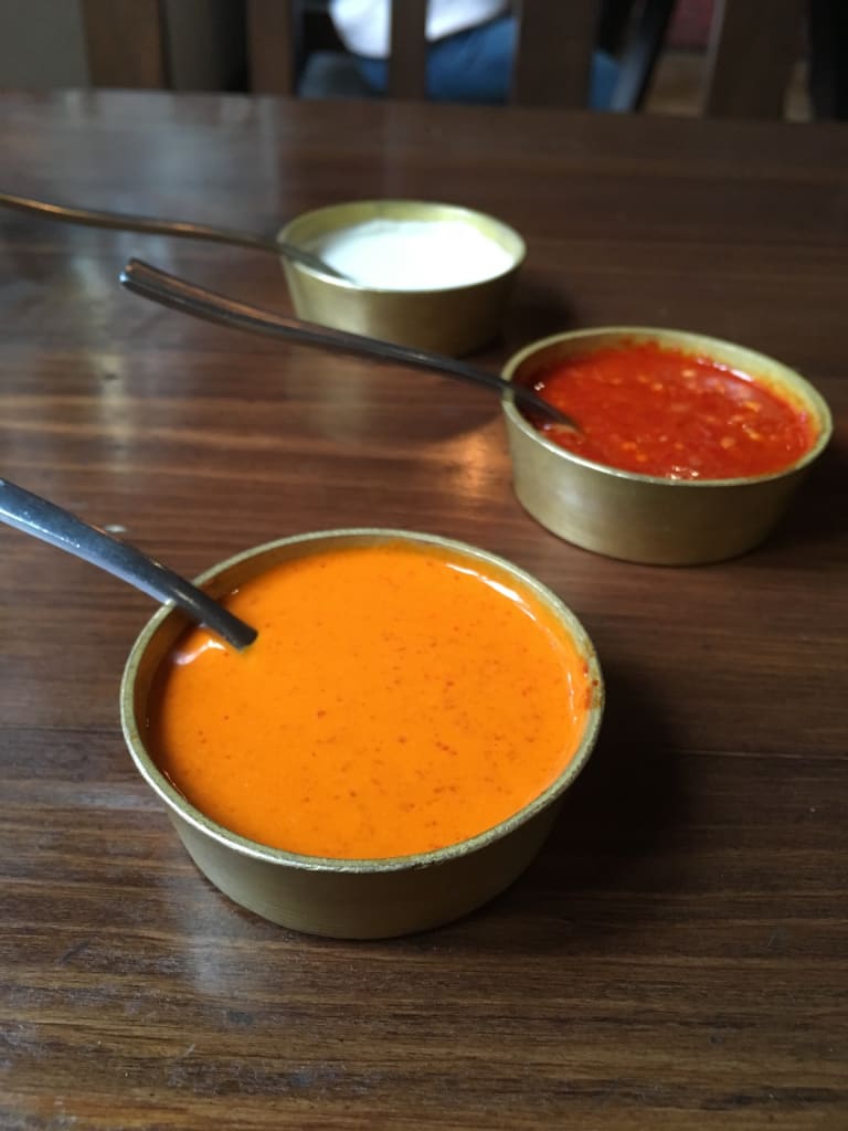 Regarding their special chutney(s), they range from amazing blazing(white), to sunset orange(fiery hot), and mind-blowing red.