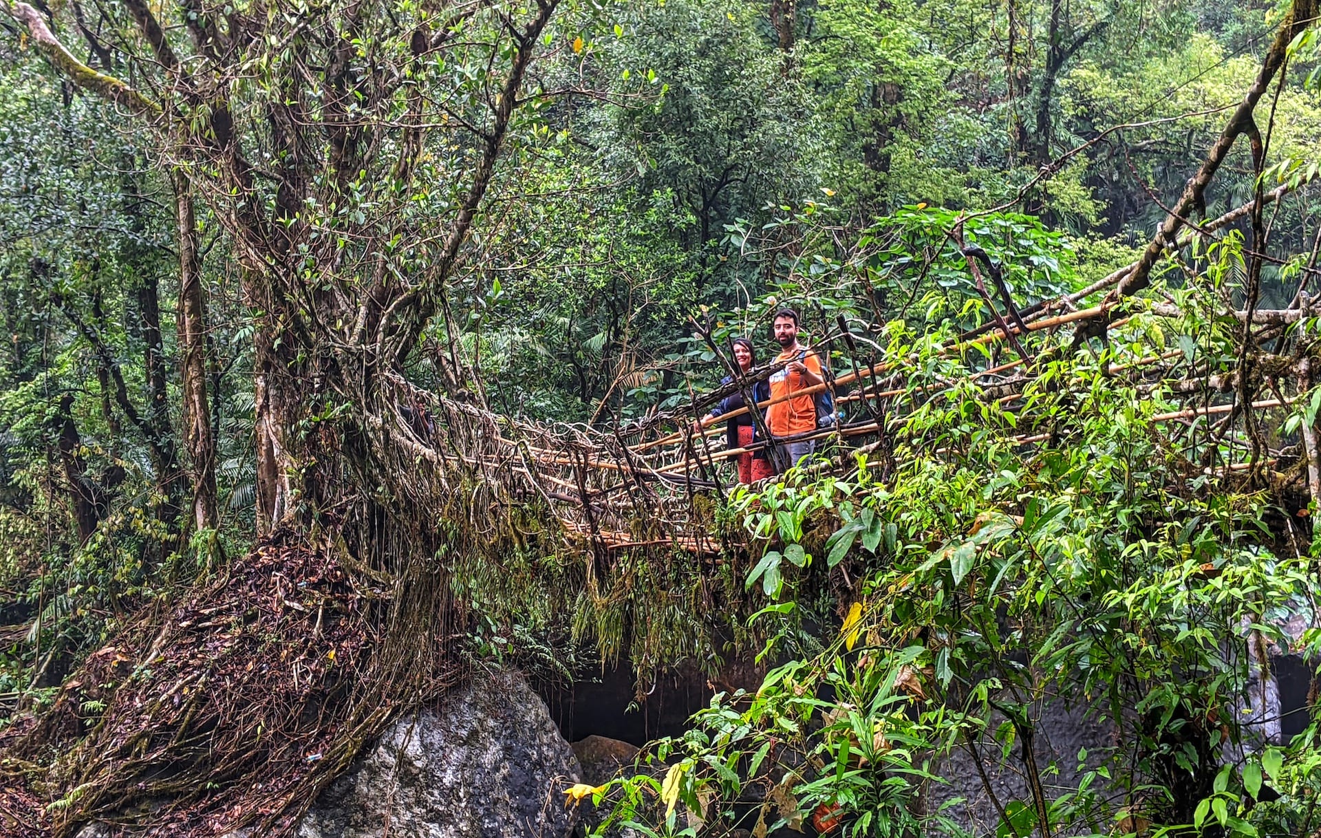 So, after about 50 mins of queue time, we could really step on the miraculous bridge. It was just roots, mud, and an artificial stair of wood to climb up to. Only 2 people were allowed at a time and below the bridge was a running rocky river. The wait was worth it.